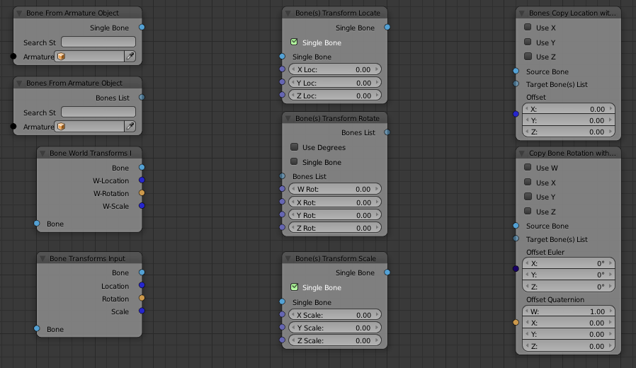 You will note the pale blue socket colours, these denote “Bone” type sockets, either a single bone, or a lists of bones. The first two nodes get bones from an armature to feed into various transform nodes; to move, rotate or scale the bone(s).