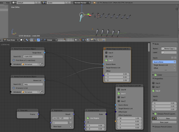This setup moves all target bones 2 units above the source bone along the bones’ Z axis. It also rotates the target bones 20 degrees more than the source bone along their X axis increasing 20 degrees every 30 frames. Ha! clever yes? The Expression nodes uses Integer Division (//) to divide the current frame by 30, so it only increases every 30 frames, and then multiplies the integer by 20.