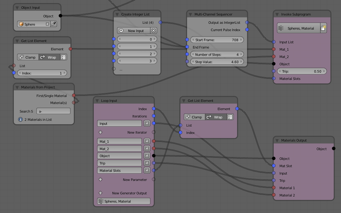 As you can see from the image above, a whole series of slots can be managed using a Loop Sub-programme. I am feeding the slots as a list of Integers; 0,1,2,3 – these could be put in as 3,2,1,0 – in which case the materials will be changed in reverse order. This loop has the effect of moving a different colour along a series of polygons to represent a “moving slice” effect, fed as it is by my “Multi-Channel Sequencer” Node, which is feeding the slot values at 4.6 frame intervals starting from frame 708 – more on this node in the “Generators” page.