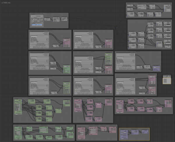 This node tree has 8 MIDI channels fed into 6 Loop Sub-Programmes and some other bits as well! It still runs at under 2.8ms on my Mac.