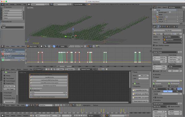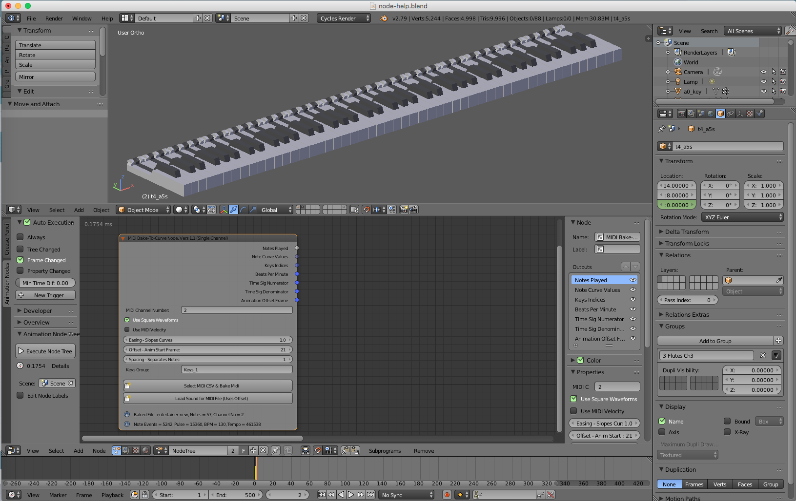 Once all these inputs are completed simply click the “Select MIDI CSV & Bake Midi” button to complete the process, this will prompt you for the MIDI CSV file on your disc. It is not necessary to have the meshes group assigned, but of course you will need to process the node again by clicking this button, if you add the Keys Group at a later stage. Once complete, the node will display information gathered from the MIDI file, such as the number of unique notes played, total note events, etc.