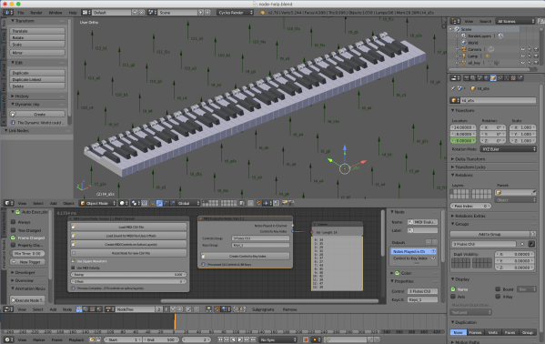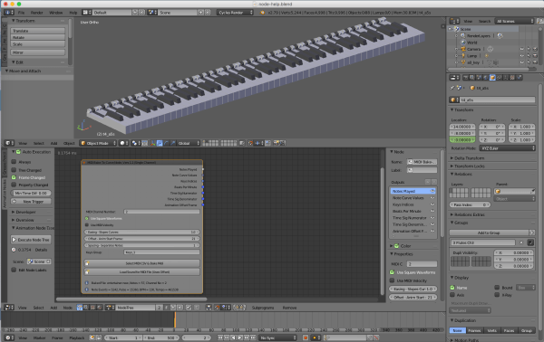 Here you can see the keys meshes, there are 88 of them and their origins are at the centre of rotation of a piano key. The naming convention is important so the system can assign keys to controls. Each key should be named by its note ident followed by an underscore, then anything else you would like. So in the picture above they are named, for example, c3_key, c3s_key, etc. It is not important what order you made the meshes in, or what order they are in the blend file, the node works out which control relates to which key and gives it an index value displayed in the Viewer Node next to the Index Node.