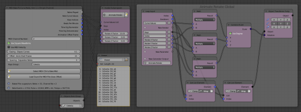 I simply use a loop sub-programme to get the value from the curves (the Iterator), which I plug into the mesh object. this mesh object is obtained by reading the Index feed to show which note curve corresponds to which mesh. The meshes are obtained by using their group name as the list input. The Rotate value is the amount in degrees that I want the key to rotate. If you look closely you will see that I have set “AV-Sync” at the bottom, so Blender syncs the replay (ALT+A) to the sound file, this is not needed if you render the animation, only for preview Play mode.