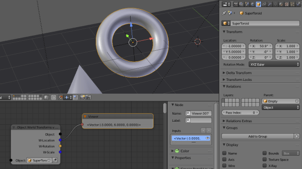 The target object will be affected by either values typed into the boxes, or by an incoming euler/quaternion for each axis that has the checkbox activated. The user should connect, or set, the rotation boxes appropriate to the object’s rotation mode. Finding the objects rotation mode shouldn’t be to difficult for the average Blender user, he said more in hope than expectation.