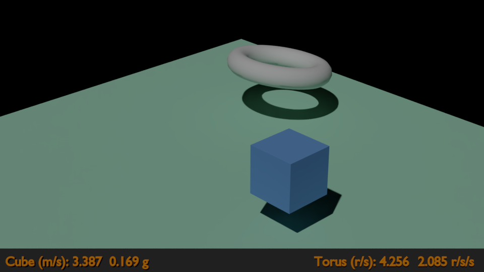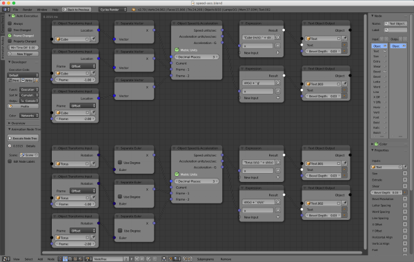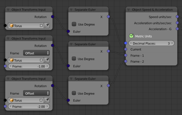 So you can see I feed the node with the current position of an object and where it was one and two frames ago, these I use to calculate two speeds, based upon the blend files Frame Rate. From these two speeds I calculate the acceleration and also express it as a factor of the Earth’s gravitational constant – e.g. 2.4g – all of the values are trimmed to the number of decimals as defined by the Decimal Places input. The node can be used to calculate rotational speeds and accelerations as well.