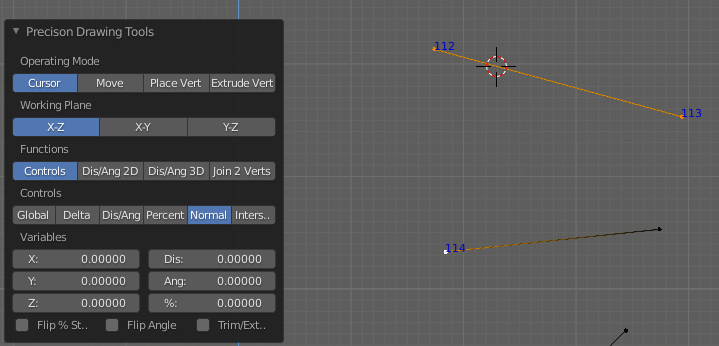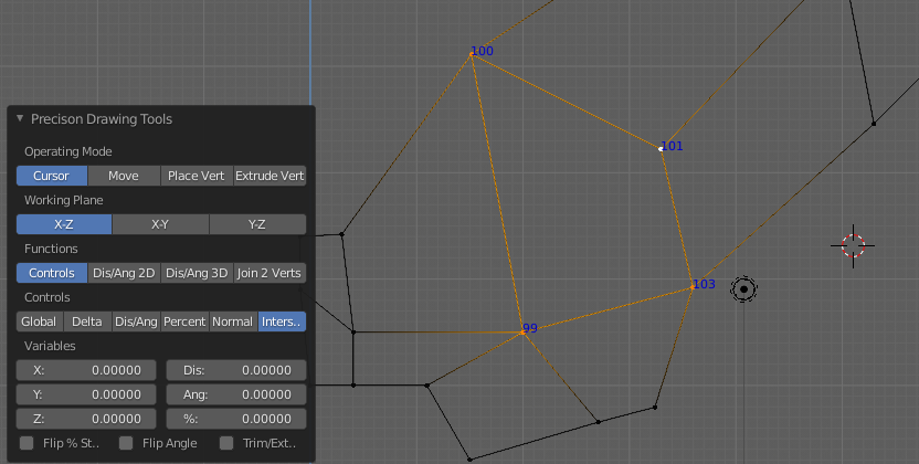 The easiest to use is the first one and most options will be obvious to a CAD operator. The Operating Modes at the top determine whether you will be placing the Cursor, moving Objects, or Vertices, Placing new Vertices, or Extruding Vertices. PDT works in both Object and Edit Modes, although, for obvious reasons, you can only add vertices, or extrude vertices in Edit Mode (don’t know why I said that, it should be bleeding obvious….).