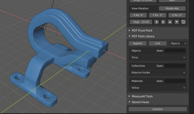 This is a depository for common used parts as objects in a library blend file located with the Add-on. Routines in PDT will enable the user to retrieve parts and to place them automatically at the cursor location. Materials and Collections are also handled by this function suite: