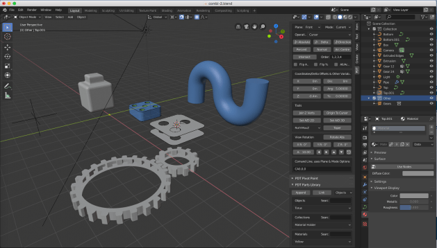 The basic idea at the moment is to store parts as either individual objects, or in the case of more complex parts, like an engine assembly for example, as collections. I have looked at the way Blender handles materials for imported objects and find that if you import an object using Append, it will bring the materials of the object with it. If you append the part many times, you get many copies of the same material – not a situation that I am very happy with. So my recommendation for this trial system is to leave the materials off the objects and store them either against a “holder” object, or set a fake user so the material is always held in the library blend file. Then you can append, or link the material once and sign it to many copies of the appended, or linked object.