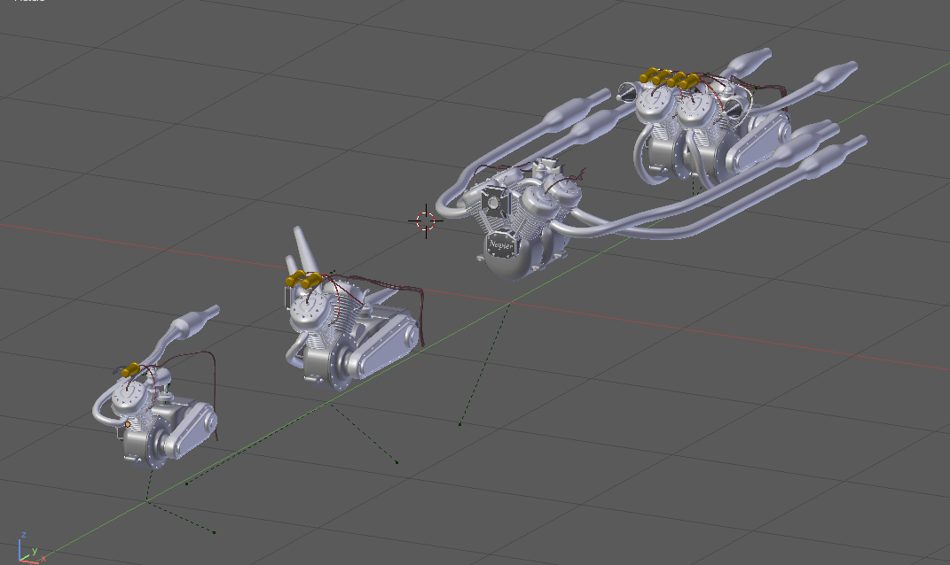 Here is an example from Blender 2.79, of a series of engines that are used in many different bikes, trikes and three-wheelers, as a Parts Library blend file: