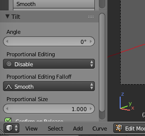 Now that we are going to change the path curve from essentially flat to definitely three dimensional, we find a new issue to contend with. When you assign the curve modifier to the fix and target planes, you may well notice that they do not stay level, this is because the vertices of the curve acquire a twist as you move them up and down, or rotate them in the various planes. This can be corrected by one of two means, the first is to “tilt” the vertices in Edit Mode. This involves using the Tilt command as found in the tool shelf below: