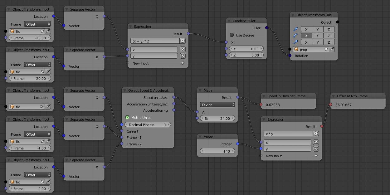 It is worth noting that you can use Expression nodes as useful calculators, just feed the variables and enter a formula, no need to get your calculator out! if you don’t have a brilliant (Ha Ha) node like my Speed & Acceleration node, you have to do all this the long complicated way, by working out offsets per frame and lots of maths.