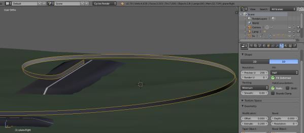The camera is in a fixed position with a Track To constraint targeted on the fix object. I have keyframed some variations of the camera’s focal length along the way so the plane does not get too big, or too small in the field of view. The model is just a simple mesh using large polys, a Sub-Surface modifier and a Mirror modifier.