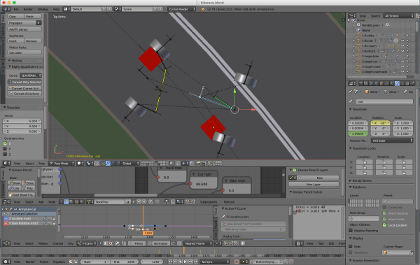 To do this we simply move the root bone over to the outside of the curve and keyframe the start point (bone’s local Z axis) at 0 and the drift at a suitable value some frames into the drift. I used keyframes 19 apart for the entry and an offset of 1.5. You also need to angle the root bone back into the corner. I used an angle of -25 degrees at the start of the drift and increased this to -32 in the centre = ass hung out further at the mid point.