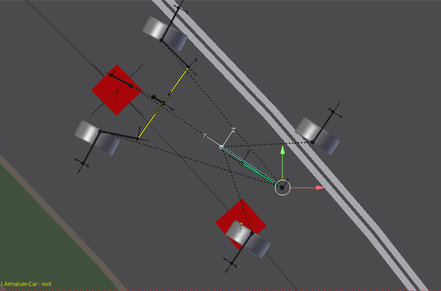 Finally, I keyframed these offsets 24 frames before the end of the drift and then all back to 0 at the end of the drift. The important thing to remember is that the root bone should point behind the front target plane, or your steering will not be turned correctly as shown below: